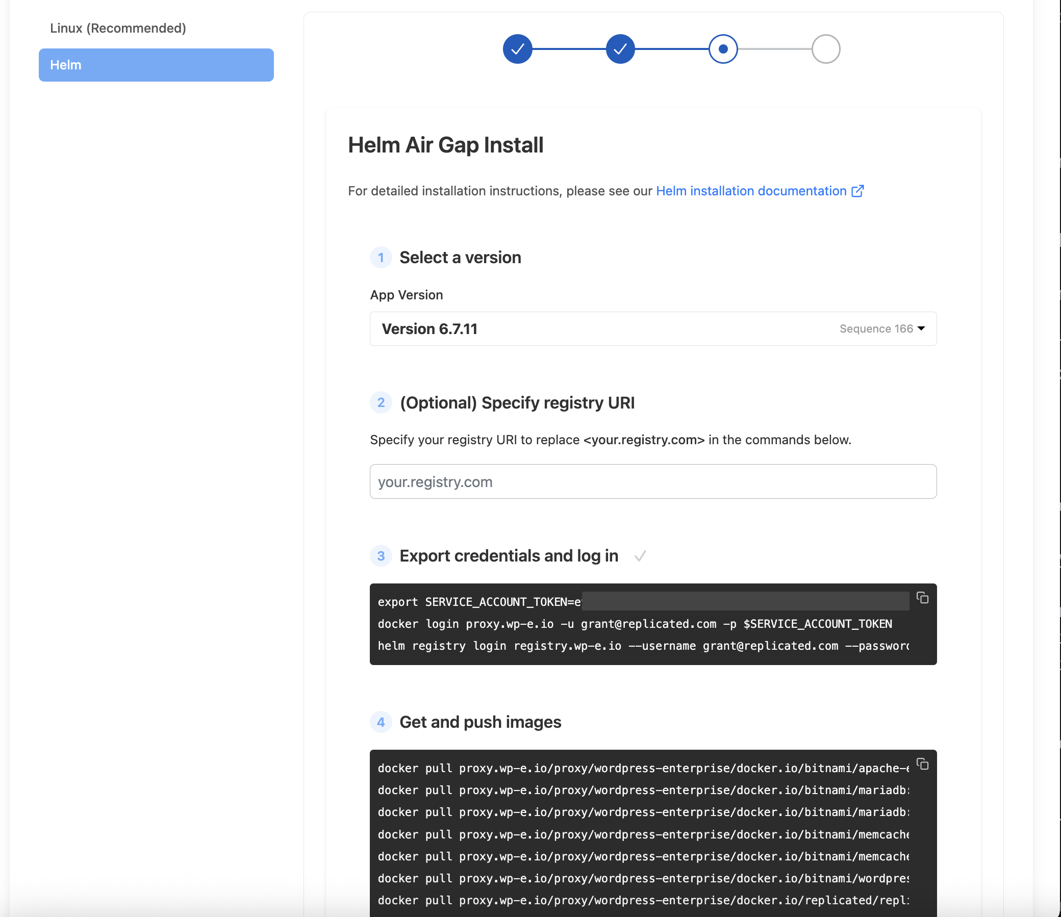 The following shows an example of the Helm air gap installation instructions in the Enterprise Portal: